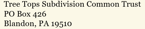 Mar 15, 2025, there are 2 houses in the Tree Tops Subdivision Common Trust that have Judgements from the Berks County Magisterial District Judge System that have not been marked as satisfied. In February/March, four houses have had current judgements satisfied and paperwork completed.