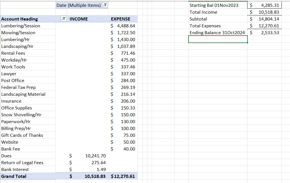 In order to complete the Tree Tops Common Spaces 2023 taxes, needed to create a balance sheet for the year to summarize the income and expenses. See the summary below – Fiscal Year is Nov – Oct.