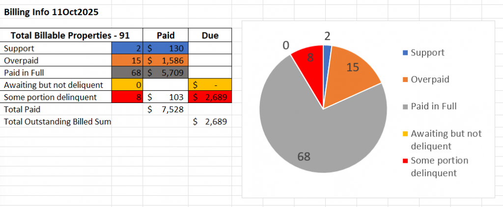 As of 01Aug2025 there are 91 houses deeded into the TTSCT. I have only billed these houses for 2025, the current billing amount is $80 per year, and will reevaluate for 2026 after we’ve completed the Inspection items.