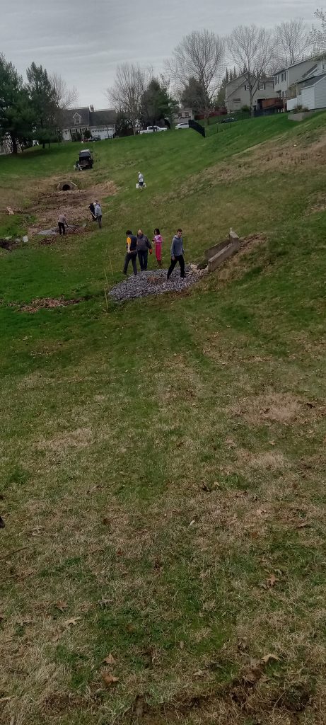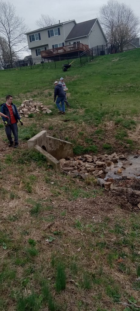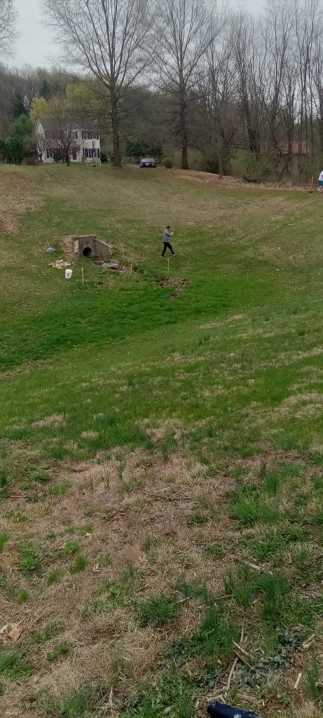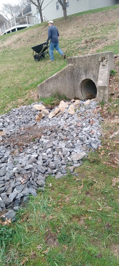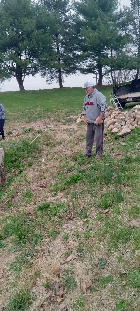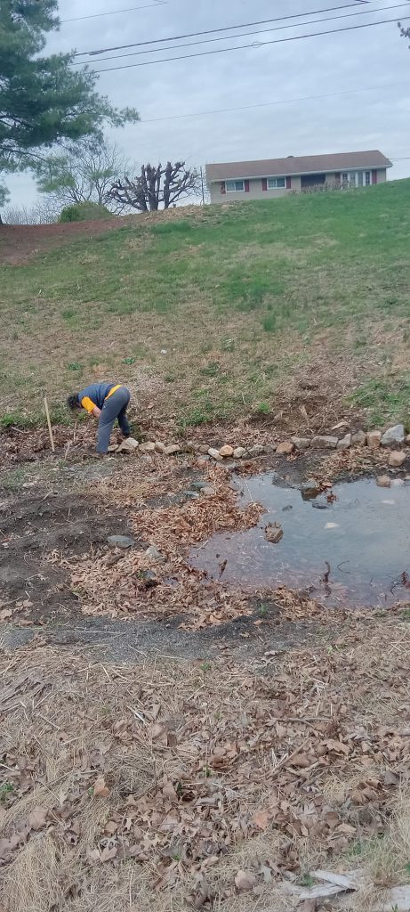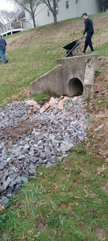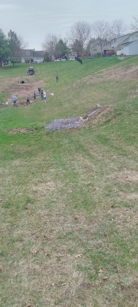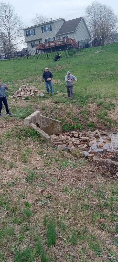At 9AM on April 5th, 2025 a group of 14 residents proceeded into the Detention Basin with hope of accomplishing five tasks to maintain the basin and complete some of the required inspection tasks. There was some rock throwing, moving of wheelbarrows full of rocks, grass planting, debris removal and removal of brush/leaves to the Maidencreek composting area. We experienced some rain showers and mild spring temperatures but accomplished the morning goals by eleven AM. Please see the attached pictures mostly after the work was completed.