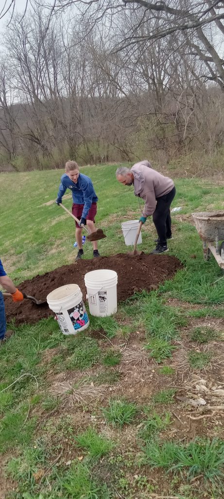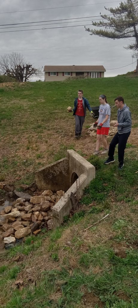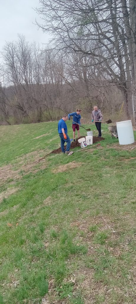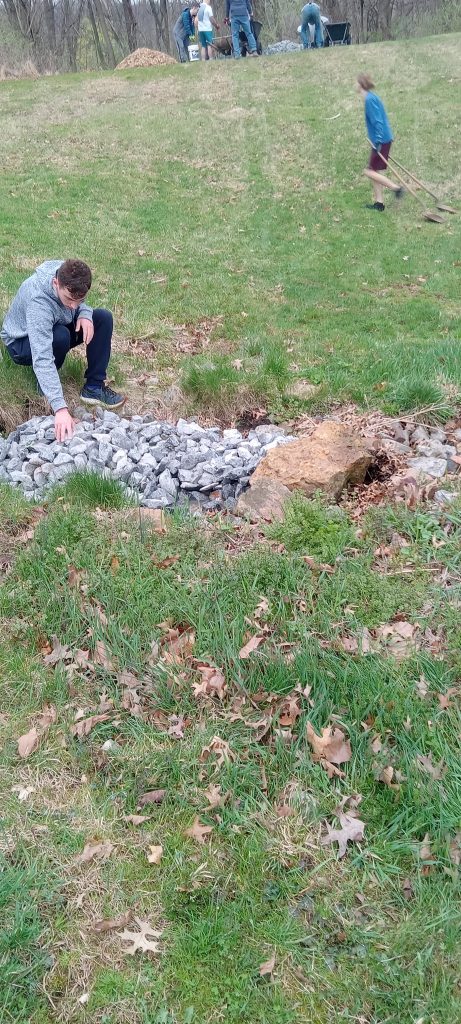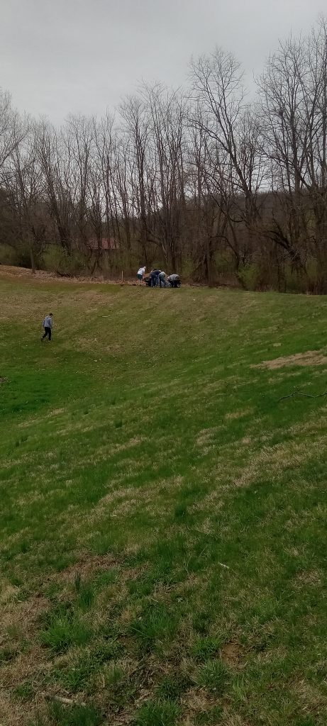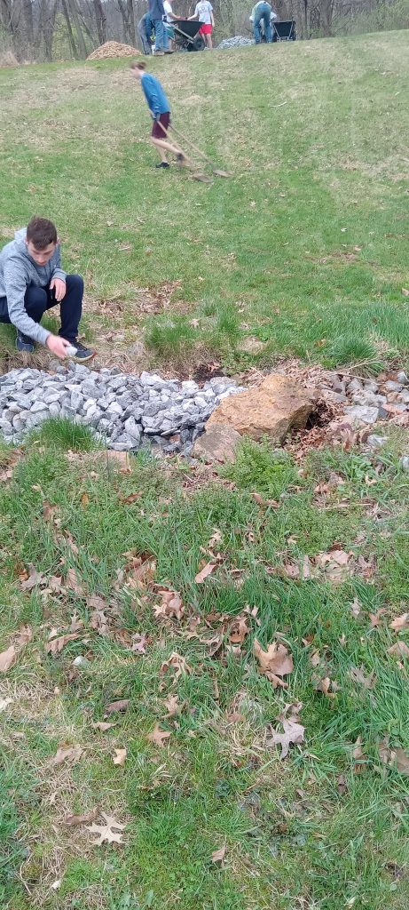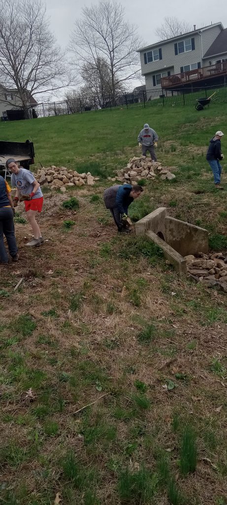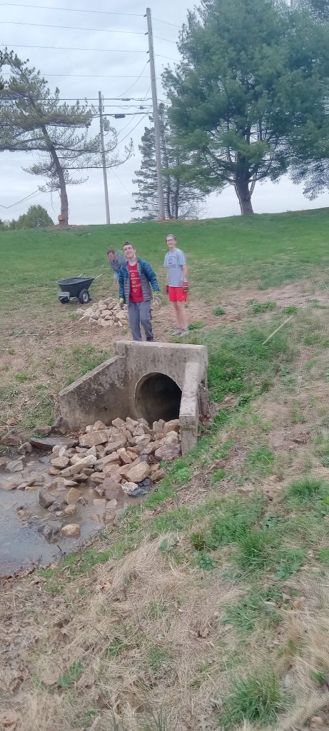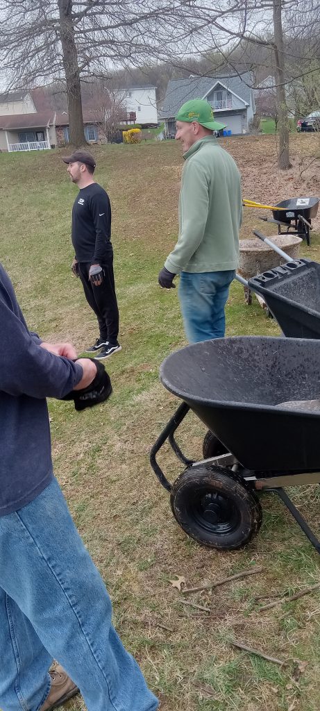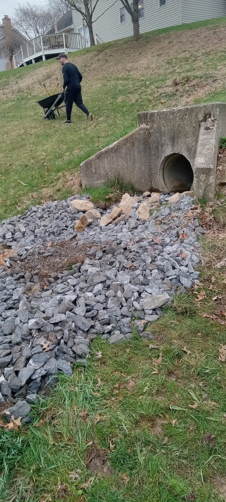 At 9AM on April 5th, 2025 a group of 14 residents proceeded into the Detention Basin with hope of accomplishing five tasks to maintain the basin and complete some of the required inspection tasks. There was some rock throwing, moving of wheelbarrows full of rocks, grass planting, debris removal and removal of brush/leaves to the Maidencreek composting area. We experienced some rain showers and mild spring temperatures but accomplished the morning goals by eleven AM. Please see the attached pictures mostly after the work was completed.